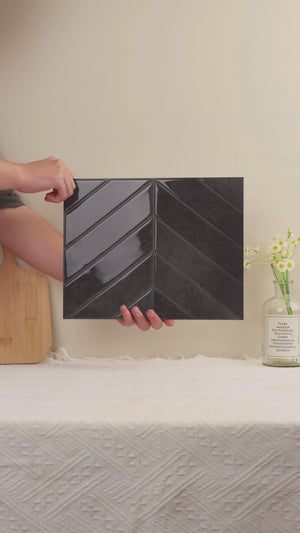 Evelina Sort är en självhäftande väggplatta med en blank yta som ger en modern känsla. Den flexibla designen gör den enkel att anpassa till både raka och böjda ytor. Plattorna fästs direkt på släta ytor utan behov av lim eller fogmassa.