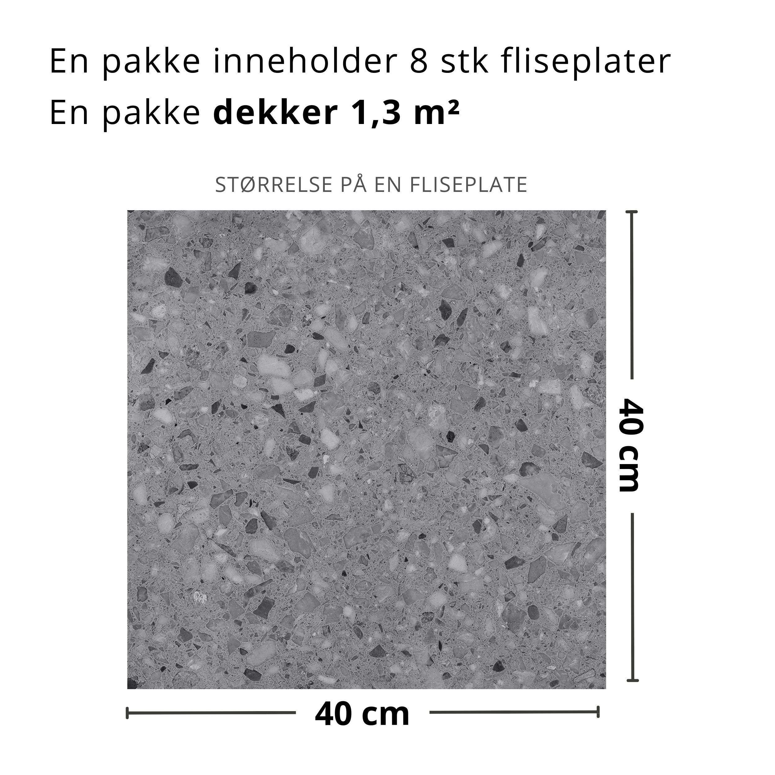 Gi kjøkkenet eller badet et nytt og moderne preg på minutter med Lisboa Grå selvklebende fliser. Disse kvadratiske 40 x 40 cm flisene har et nøytralt, gråfarget med terrazzo mønster og matt finish