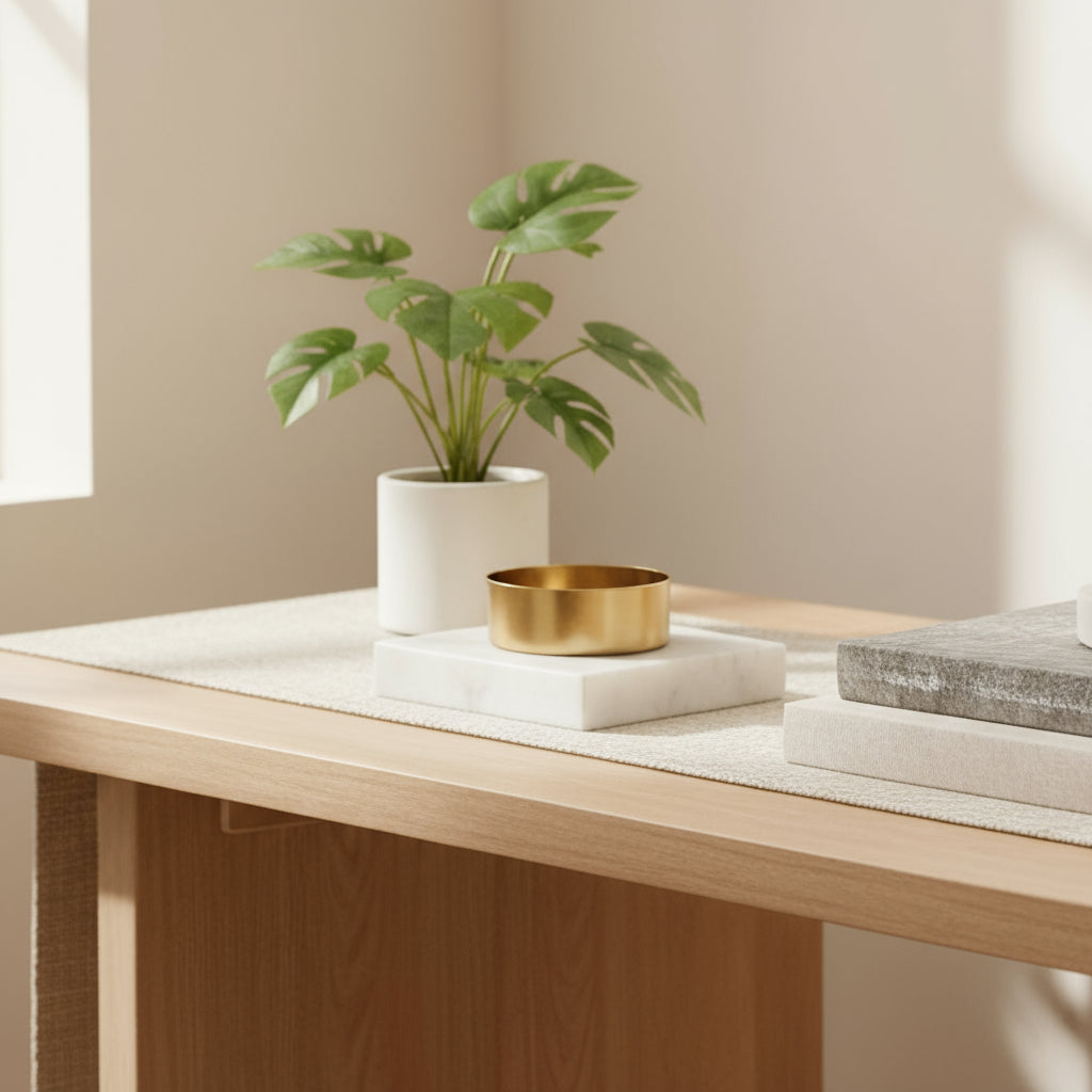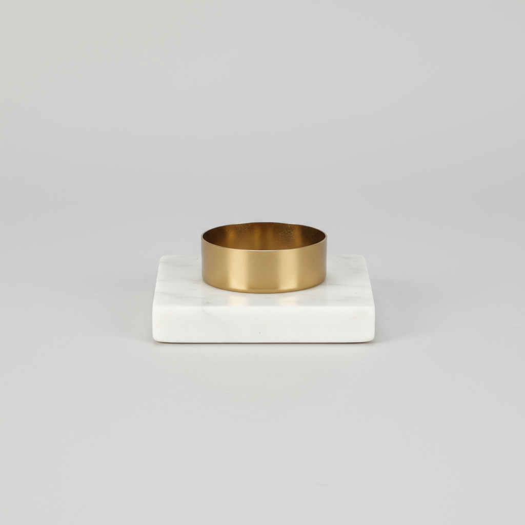 Lysestake i hvit marmor med gullfarget holder på lys trebord