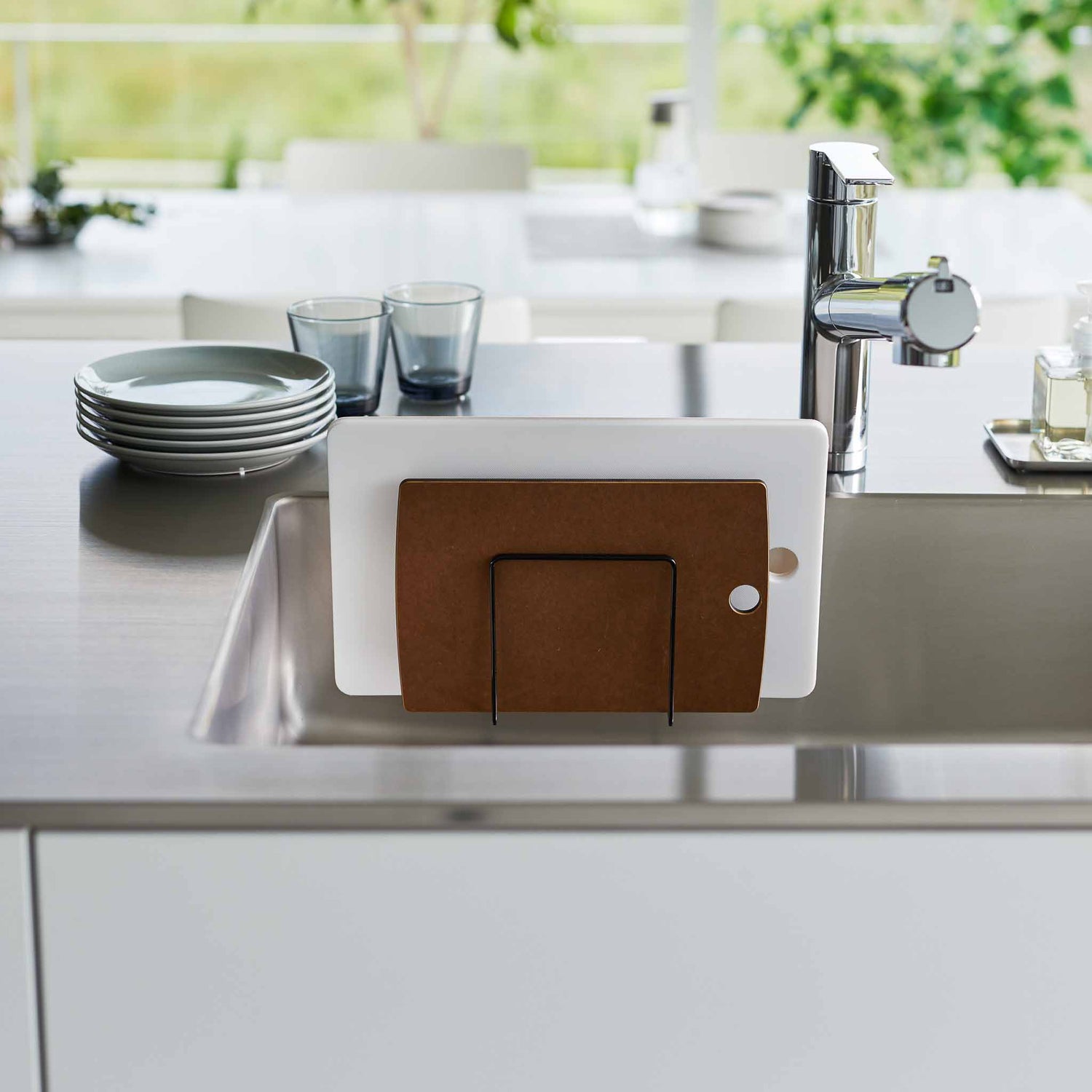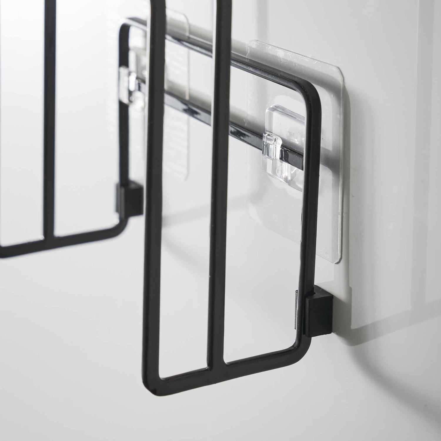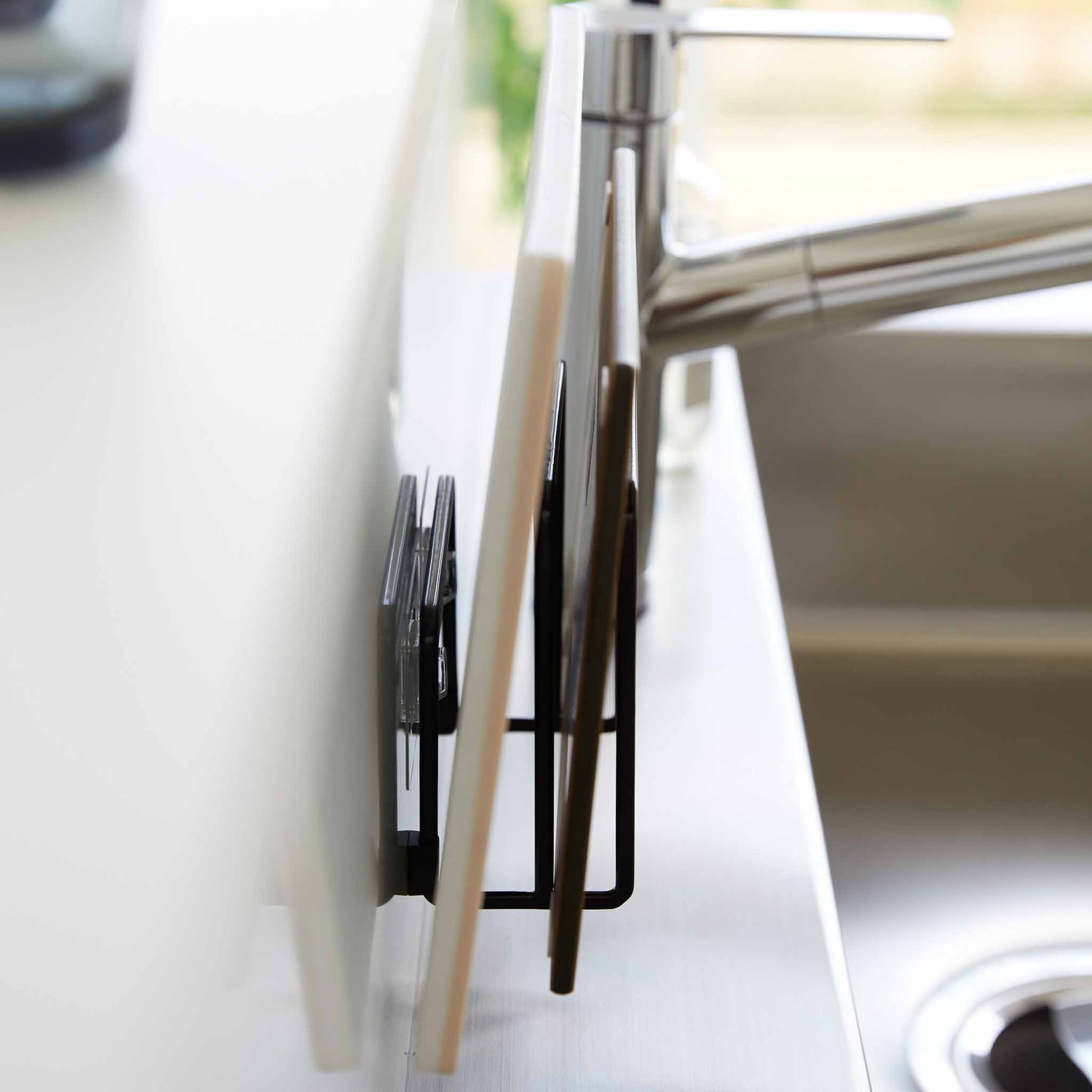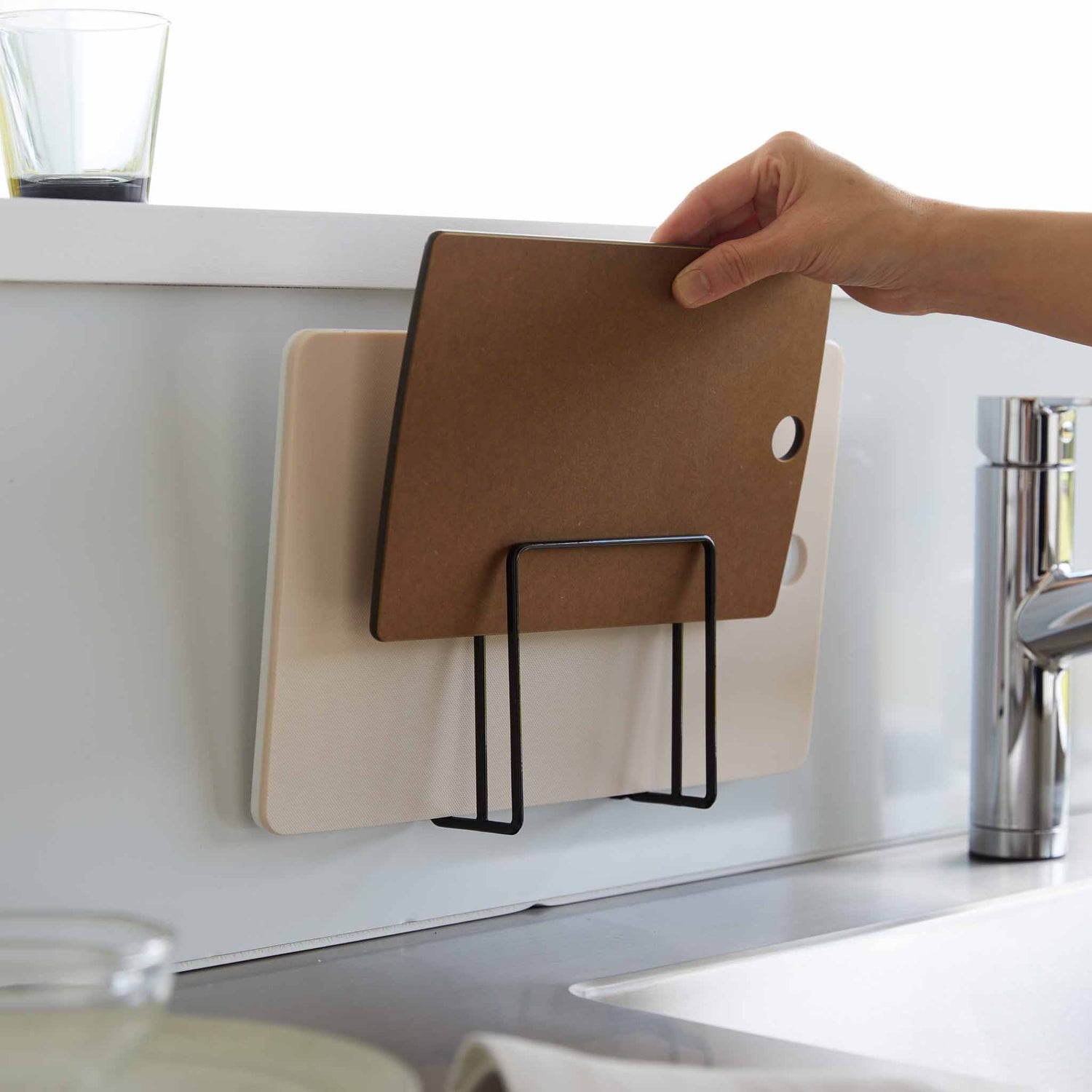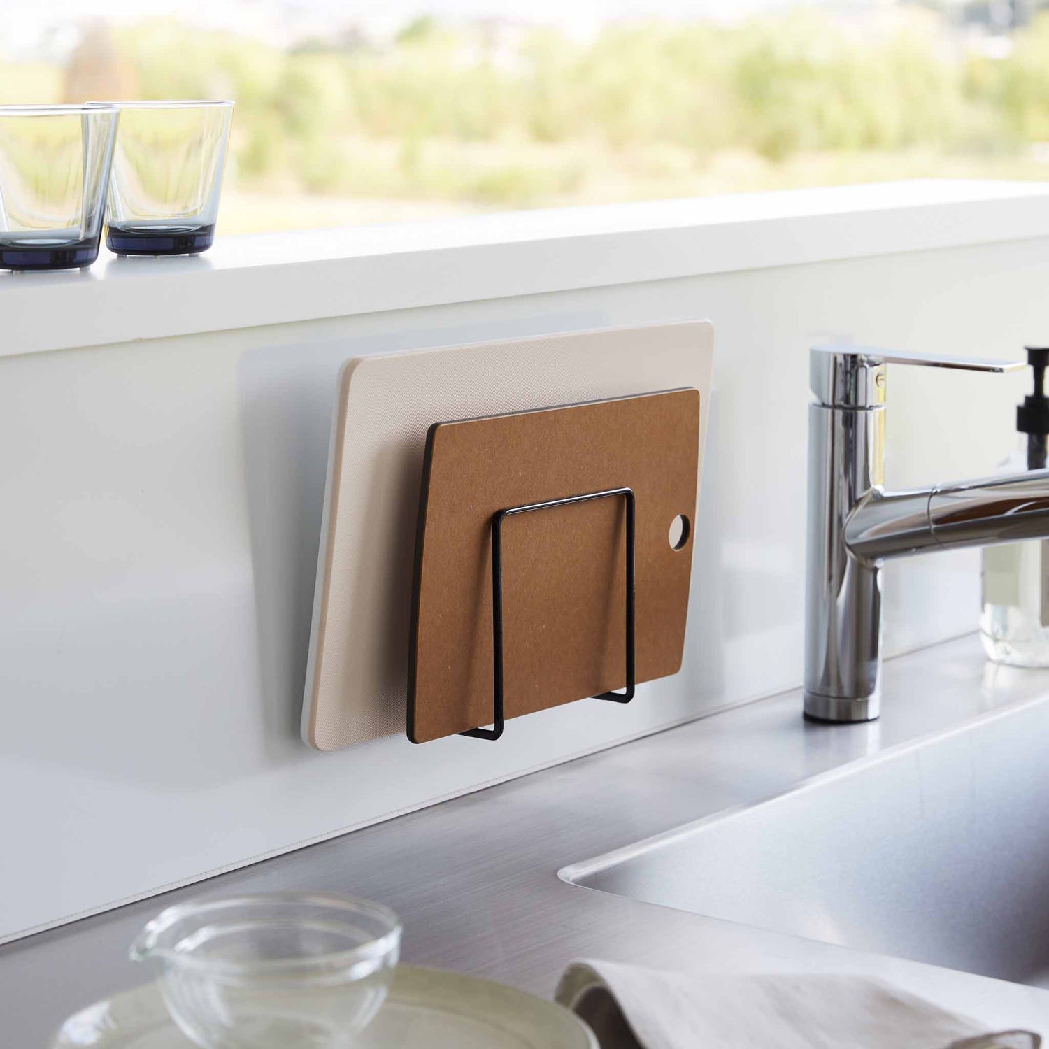 Sort selvklebende holder til skjærebrett med to rom montert på kjøkkenvegg