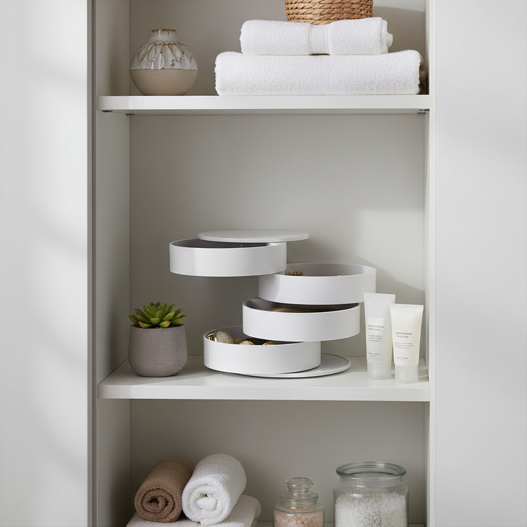 Det roterande smyckesasket i vitt är en vacker förvaringslösning för smycken och små accessoarer.