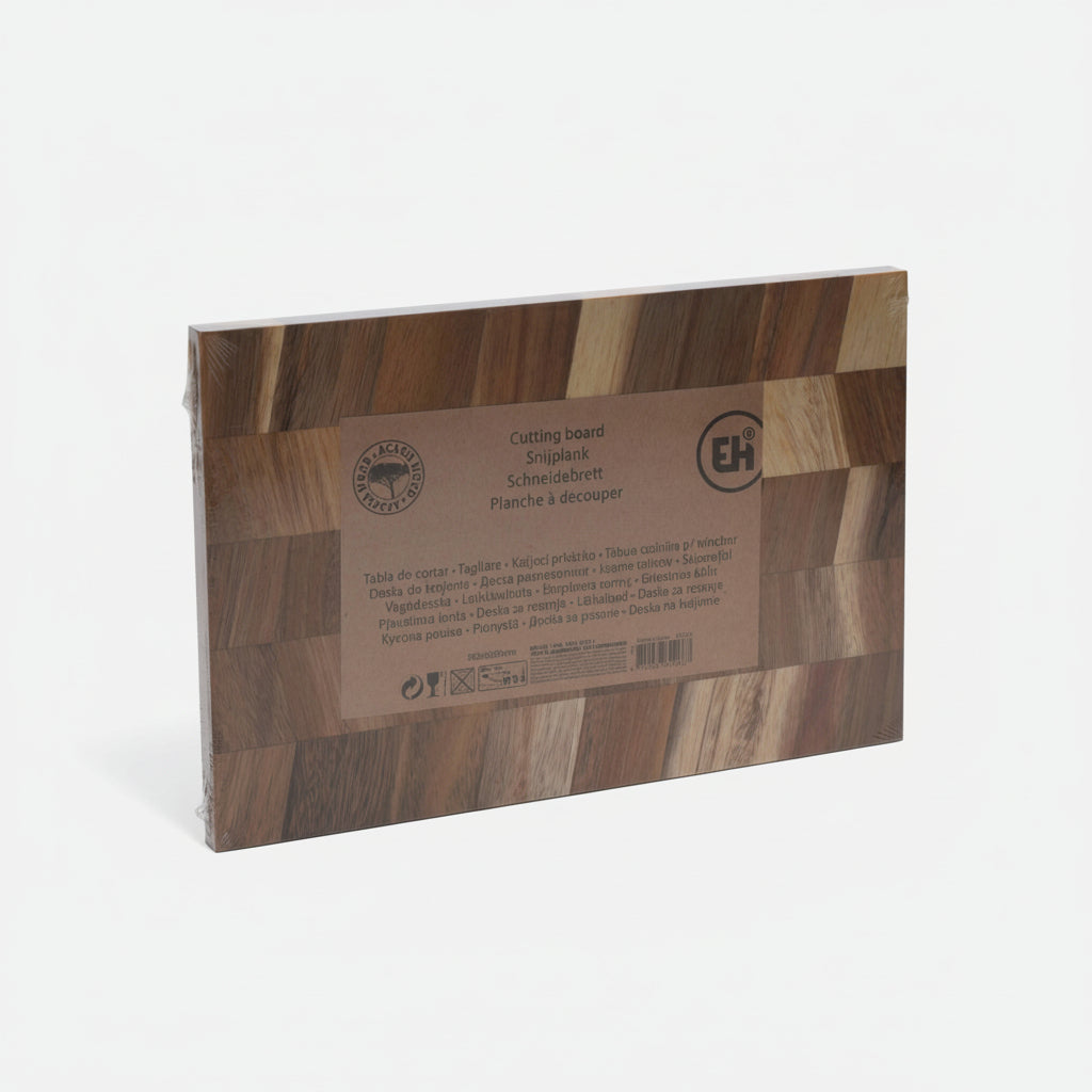 Vacker och funktionell skärbräda tillverkad av massivt akaciaträ med fiskbensmönster. Den naturliga trästrukturen och den varma glöden ger brädan ett exklusivt utseende, samtidigt som den tål daglig användning.