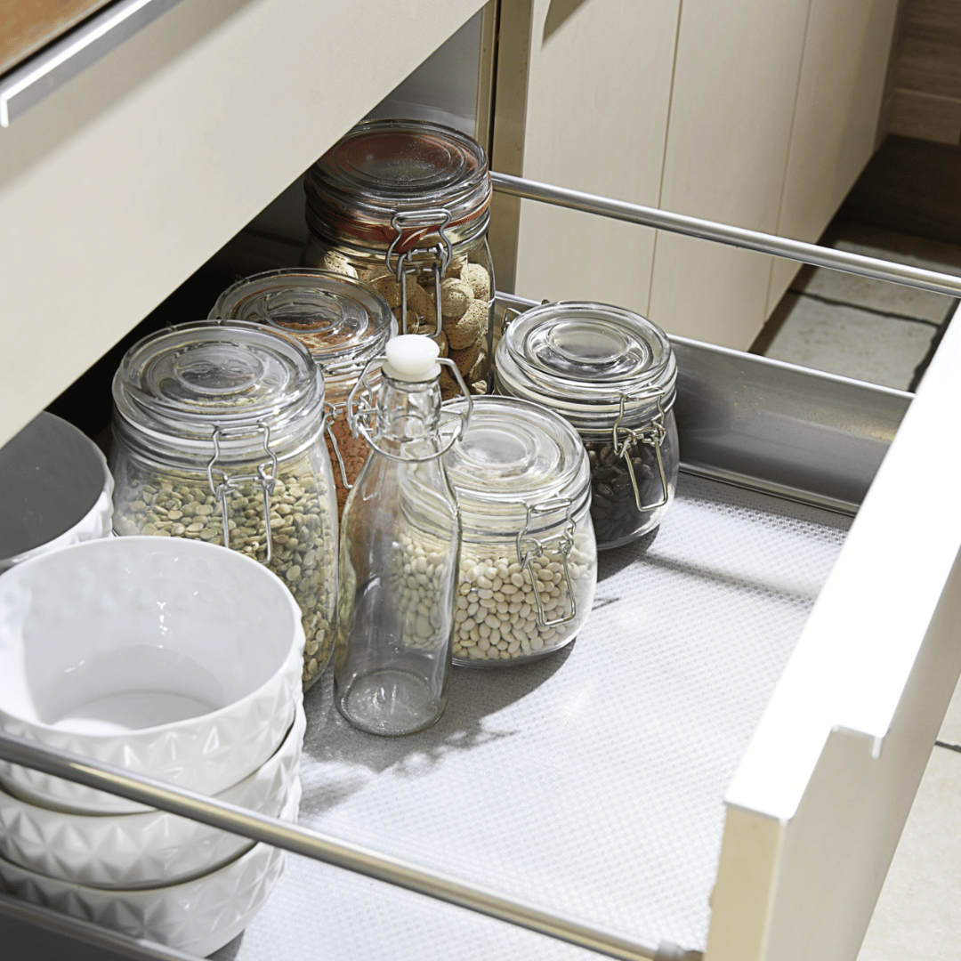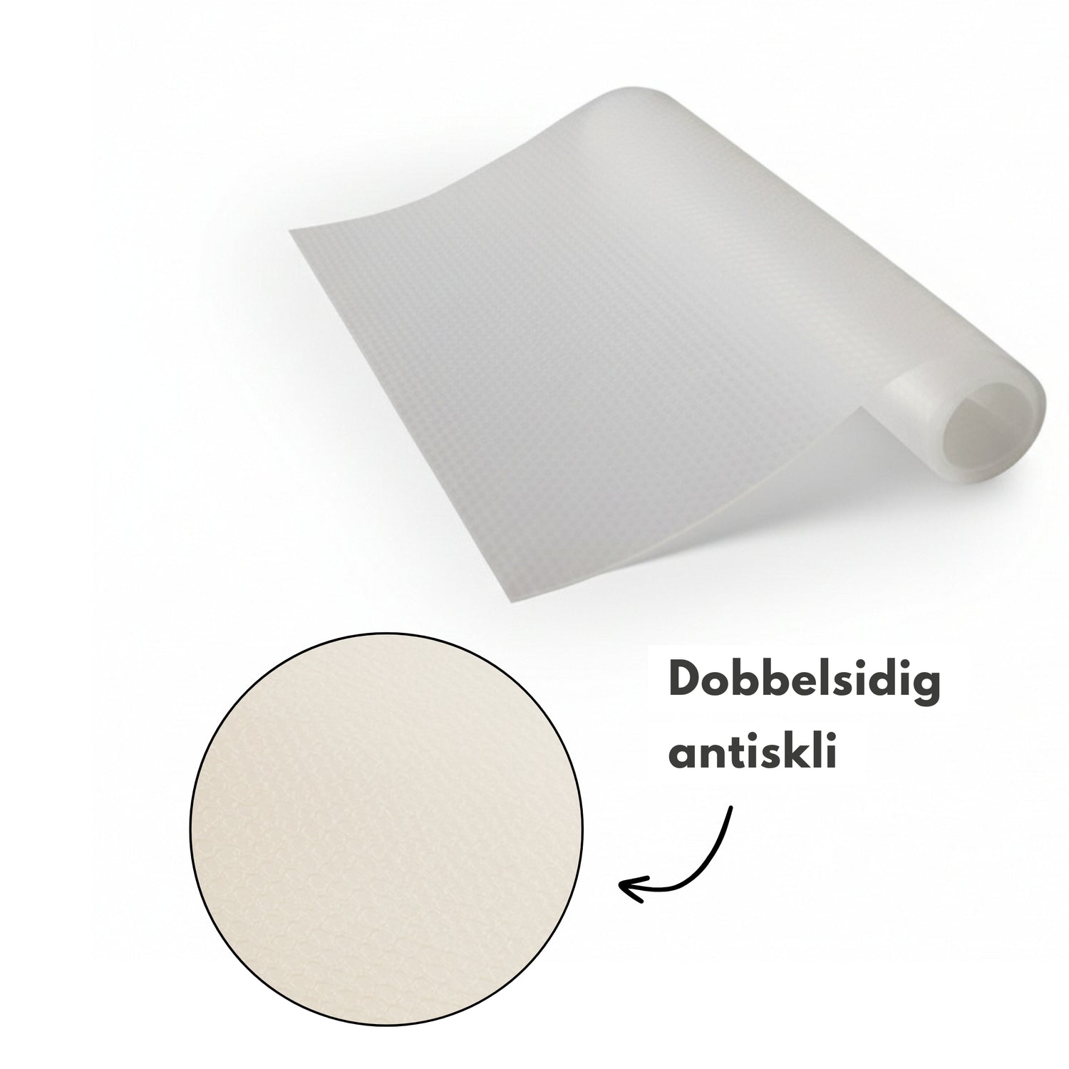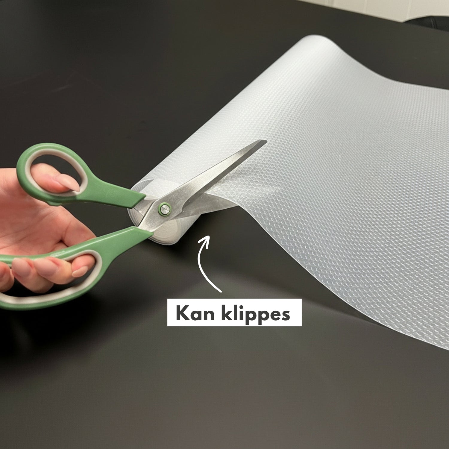 Lådinsatser till kökslådor, under diskbänken, skåpinredningar, kylskåp och vitrinskåp etc. Denna genomskinliga antiklimat håller dina saker på plats, samtidigt som den dämpar ljud och förenklar städningen av området. Mattan kan anpassas till din skåpdekoration genom att skära den till önskad storlek.