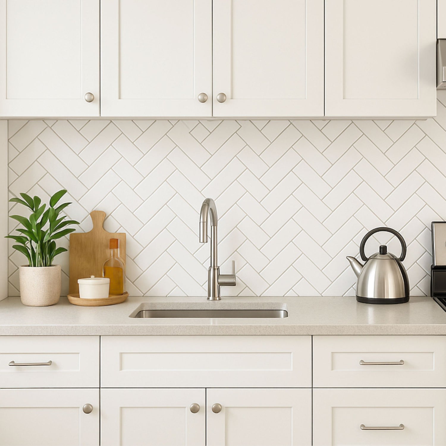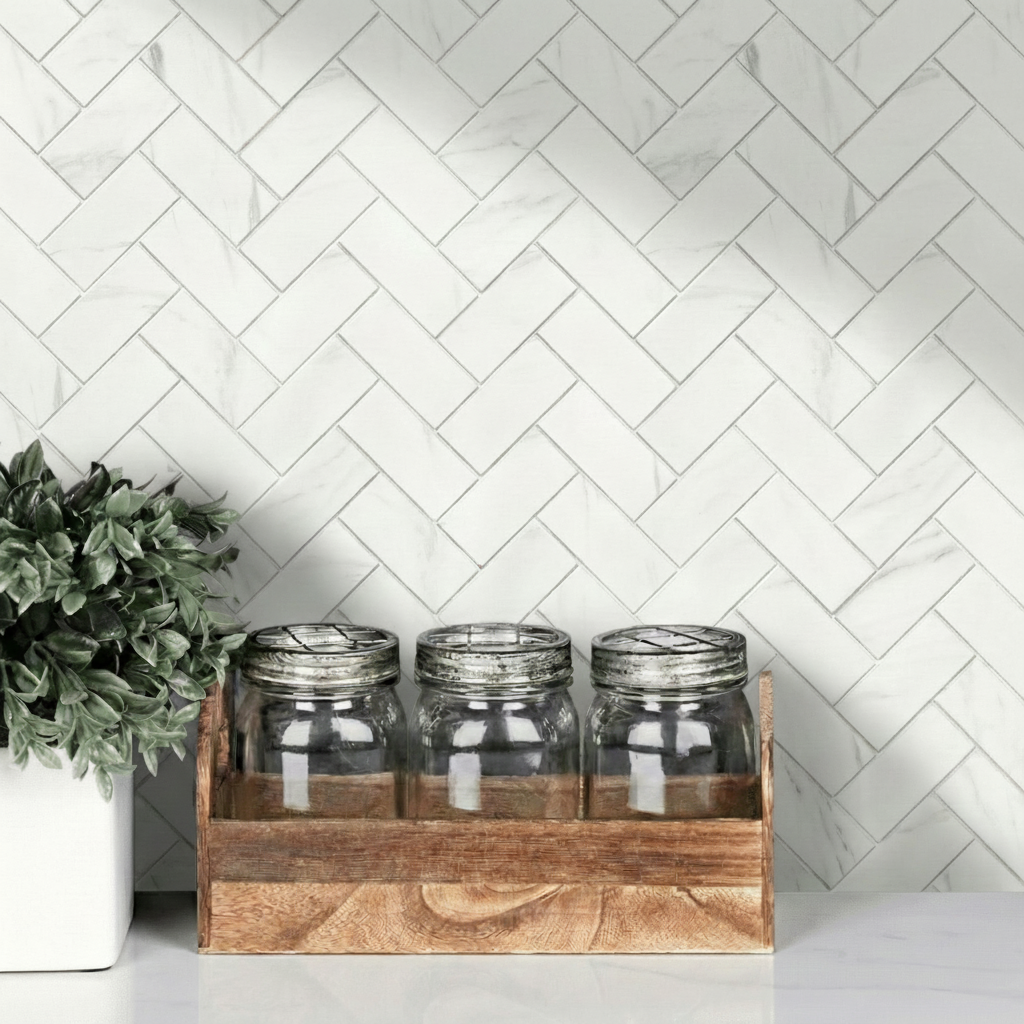 Stein Herringbone Marble Självhäftande Väggplattor kombinerar den klassiska marmorlooken med ett modernt fiskbensmönster . Designen består av vita kakelplattor med subtil grå marmorering och en sval underton – perfekt för skandinavisk stil. Kakelplattorna skapar en elegant och tidlös vägg som passar perfekt ovanför köksbänken, i hallen eller i tvättstugan.