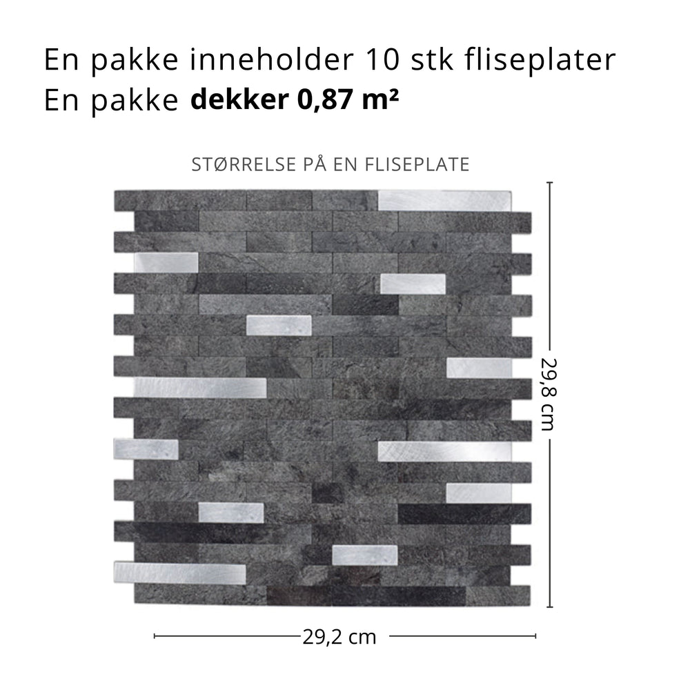 Sten mörkgrå självhäftande väggplattor imiterar sten i mörkgrått. Plattorna har insatser av silveraluminium.