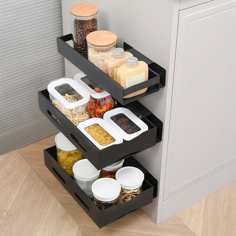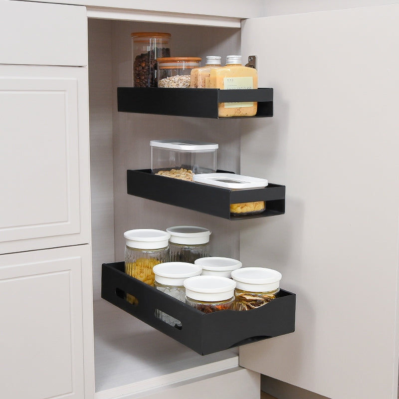 Vägghängd utdragbar hylla i mattsvart metall. Perfekt för förvaring av mat, hobbyer, rengöringsprodukter eller skönhetsprodukter. Fixa hyllan i köksskåpet, under diskbänken, på sidan av badrumsmöblerna eller var du nu kan behöva den. Få ett städat och organiserat hem med denna fantastiska utdragbara hylla.